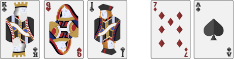 | 8 | Bull 7 | ![]() | Tổng 3 lá bài là bội số của 10. Tổng 2 lá bài còn lại là 7 hoặc 17. |